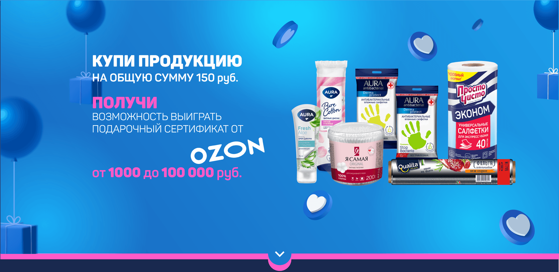- Совершить покупку продукции COTTON CLUB в отделениях «Почта России» (бренды: “Я самая”, “AURA”, “Солнце и луна”, “ПРОСТО ЧИСТО”, “QUALITA”, “LURE” на сумму не менее 150 рублей);